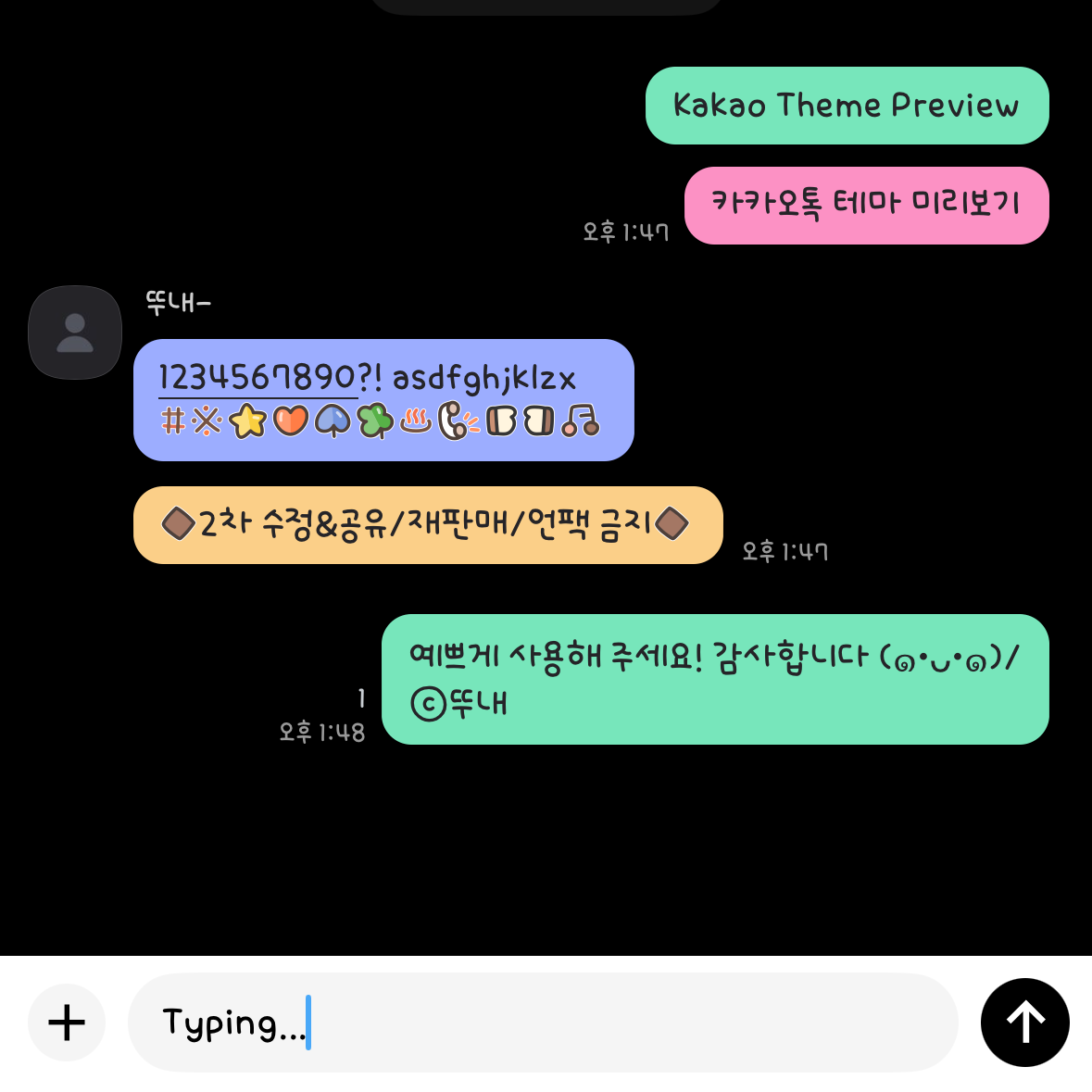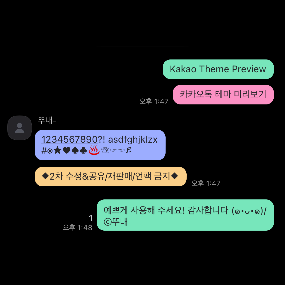 알록달록한 말풍선으로 이루어진 블랙 컬러의 심플한 카톡 테마입니다.